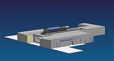 Kistler Sole Source Contract The best destination for those now unallocated tax dollars is open access, performance based contracts (a.k.a. prizes) under the NASA Centennial Prize program. If that is done, it will do wonders to invigorate commercial space development and spur new entrants into the orbital space launch business, just as the X Prize has done for sub-orbital. SpaceX Launch Pad at Vandenberg Air Force Base We do not use a permanent tower on the pad, employing instead our mobile erector/launcher platform. This is stored in a protected environment when not in use, so is not subject to weather damage and corrosion. This makes our maintenance costs very low and minimizes time spent on the launch pad, which in turn reduces our launch operations costs. We can prepare the entire rocket for launch in the controlled environment of our factory, rather than do final assembly at the launch site. Right now, all the electrical and communications wiring is in process of being installed and connected to the base grid. In addition, there is a lot of plumbing work to connect liquid oxygen, RP-1 kerosene, helium and nitrogen. These feed into the quick disconnect umbilicals on the rocket, which detach as the rocket lifts off. The water deluge for heat and noise suppression on launch will just use standard base water pressure, as Falcon I doesn’t need anything more to meet specifications. The CAD solid model below shows what Falcon I will look like on the pad with the mobile launcher, before it is erected for flight: