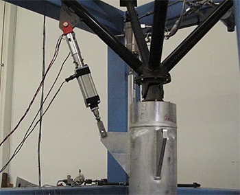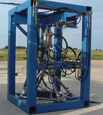 Thrust Frame The corner fittings are precision machined and then welded under argon to the gun drilled tubes. The whole frame only weighs 74.8 lbs and is shown below going through structural qualification. We loaded it to 150,000 lbs (almost twice maximum flight load) in the axial direction and applied max gimbal and TVC loads. Nine limit and ultimate load cycles were applied with no indications of yield (strains all returned to zero).
