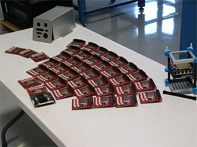 Stage Separation The test proved that the stage separation system functions properly and produces a more than adequate impulse to clear the second stage engine from the first stage during flight. We’ve also tested separation with an offset center of mass and one of the separation bolts firing late and all results are positive. If the second stage engine nozzle does hit the interstage on exit, the worst that will happen is that the niobium nozzle will be dented and immediately undent upon ignition. We chose a refractory metal nozzle over a carbon-carbon nozzle for exactly that reason. The latter will crack like a coffee cup on impact (a la the Shuttle wing leading edge). Avionics, Guidance and Control The red relay boards pictured below are the computer's interface to the rest of the rocket (arranged in theater seating). The computer controlling the rocket is the green board at the lower left. We are not 100% certain, but this is probably the most powerful rocket flight computer in the world, since it is the most recently designed and the only one to use current 21st century technology. It is certainly much more powerful than what’s used on the Space Shuttle. The flight relay boards (FRBs) are the arms, legs, eyes and ears of the flight computer, doing things like issuing the deploy command to the payload, collecting data from the IMU, issuing commands to the pressure controllers, collecting analog sensor data, actuating valves and firing the stage separation bolts. The aluminum enclosure on the upper left houses the boards and the shock mounted cage on the right is what holds them in the deck.